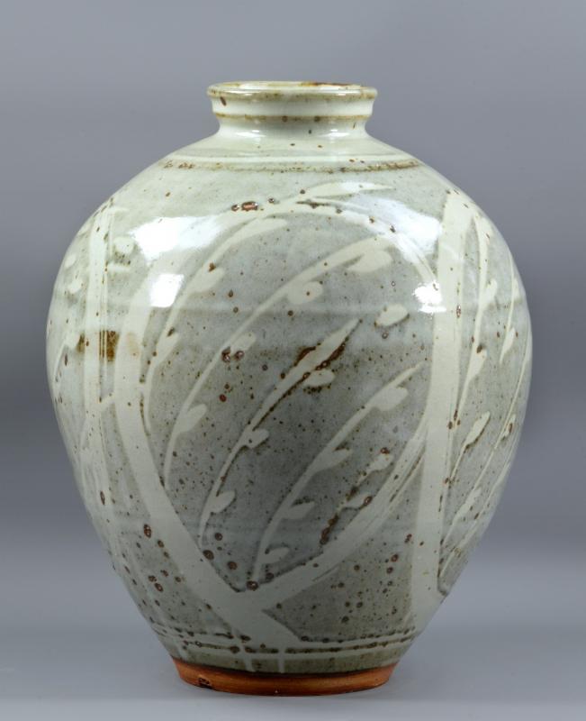 Lot 250 of 523: MARK GRIFFITHS (born 1956); a large stoneware bottle decorated with grasses on a speckled grey ground, impressed mark, height 40.5cm.
