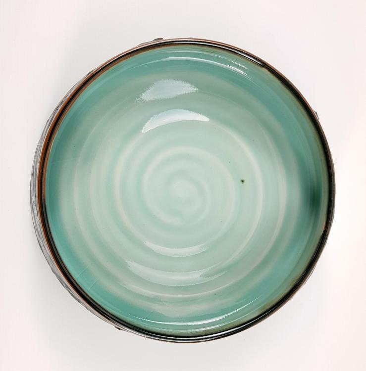 Lot 319 of 523: ALEX SHIMWELL (born 1980); a large textured porcelain dish covered in tenmoku breaking to khaki and celadon glaze, impressed S mark, diameter 33cm.