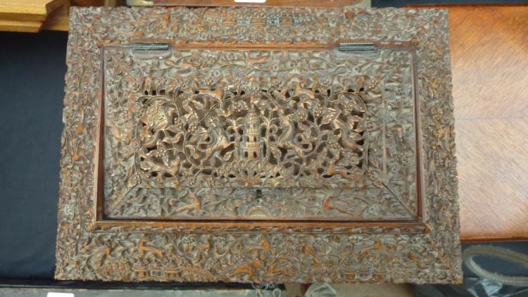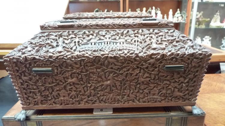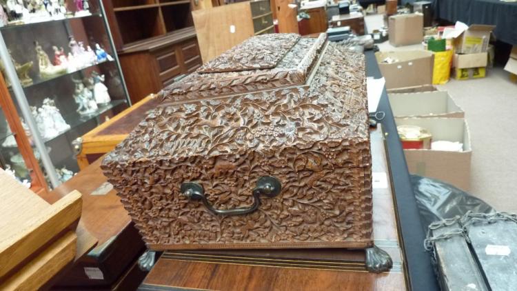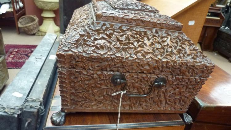 Lot 1 of 2597: A good 19th century twin handled Indian sandalwood work box of sarcophagus form, profusely carved with flora and fauna and with pierced detail to hinged top, the fitted interior similarly carved with inset mirror and an arrangement of lidded compartments, bone thimble cases and thread barrels with micro mosaic tops (one lacking top), raised on four paw feet, approx 17.5 x 34 x 24cm.
