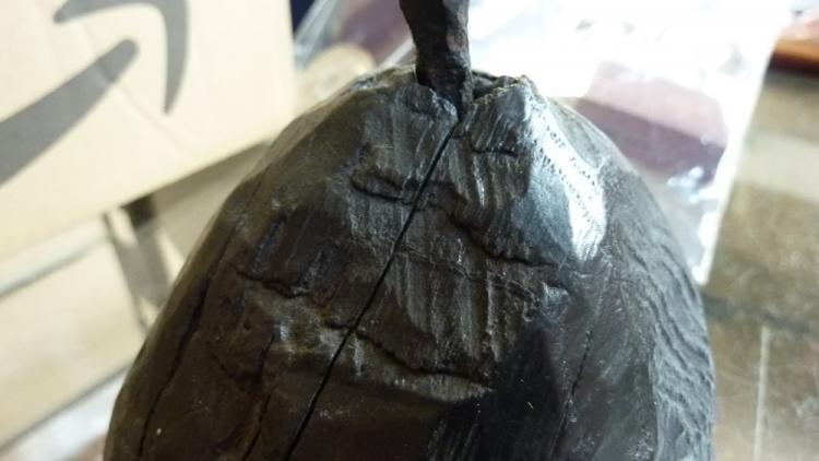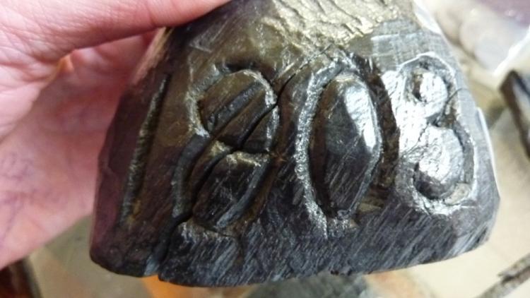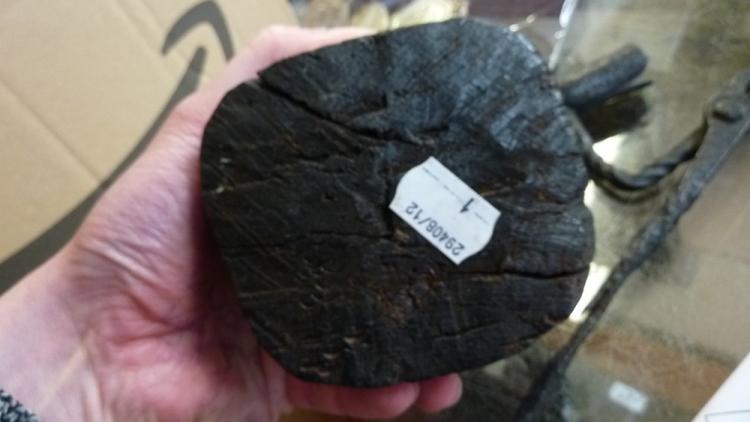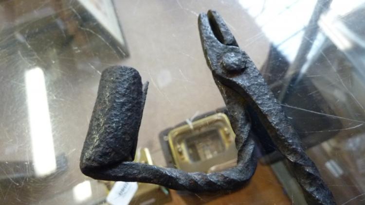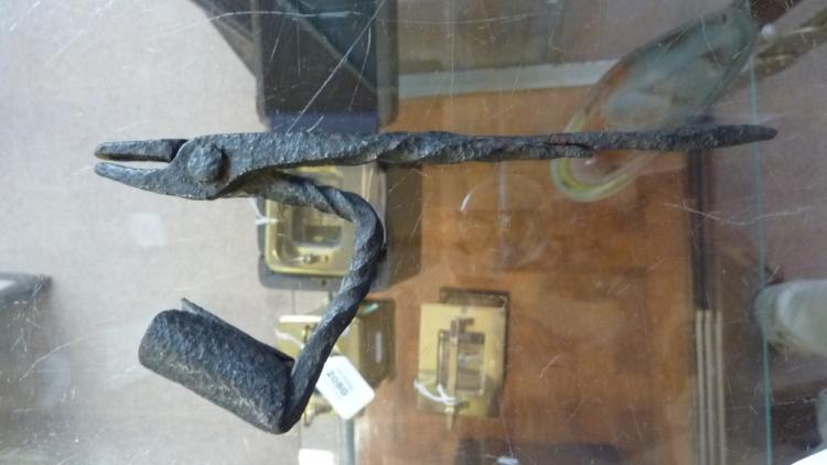 Lot 27 of 2597: A George III wrought iron rush light on adzed oak base inscribed '1803', height 21cm (the light detached from base).