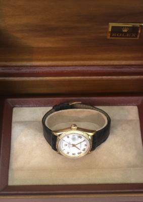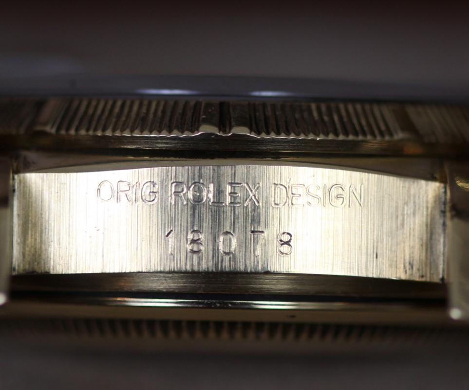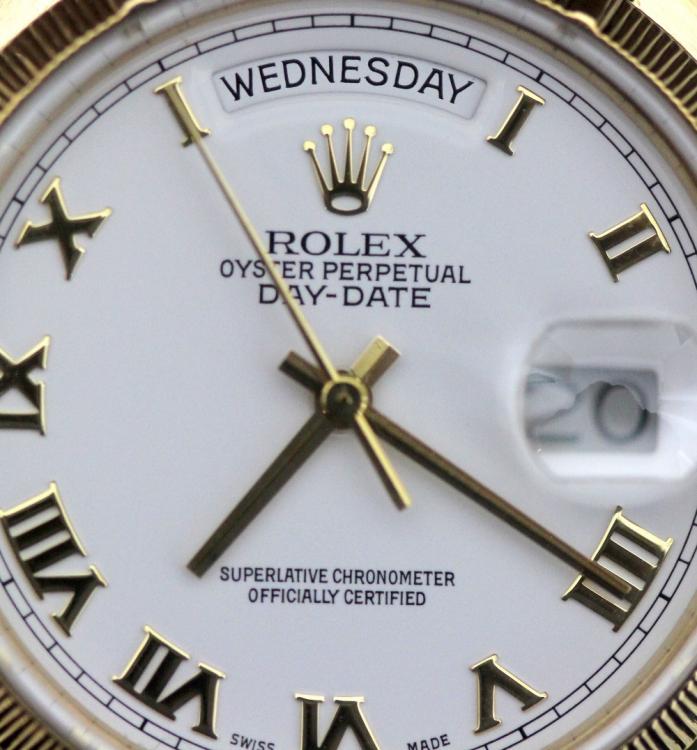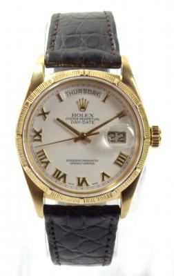 Lot 2038 of 2597: ROLEX; a gentleman’s 18ct yellow gold Day-Date wristwatch, 18078, with white dial set with Roman numerals, all original including strap and box, Cal. 3055 movement, diameter 36mm.