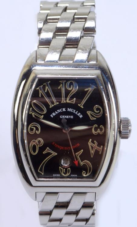 Lot 2040 of 2597: FRANCK MULLER; a stainless steel 'Conquistador' automatic gentleman's wristwatch, the tonneau set with applied graduated Arabic numerals and with circular date aperture, number of the case 1071, reference 8002 SC, on wrythen brick bracelet, with leather presentation box and two spare straps, with certificate of guarantee and numerous repair reports and receipts.