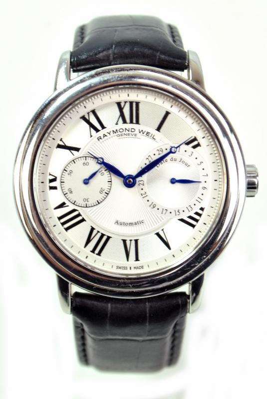Lot 2041 of 2597: RAYMOND WEIL; a Maestro stainless steel wristwatch with circular dial set with date and seconds apertures, no. V220216, boxed with papers.