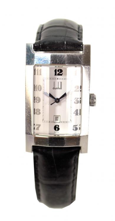 Lot 2042 of 2597: DUNHILL; a stainless steel 'Dunhillion' quartz gentleman's wristwatch, the tank case with faceted glass and dial set with Arabic numerals and date aperture, on original black leather strap and spare brown leather strap, boxed.