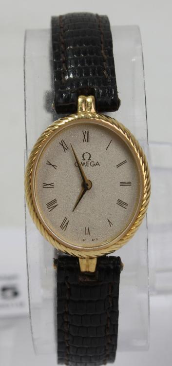 Lot 2055 of 2597: OMEGA; a lady's yellow metal cased quartz dress watch, the oval dial set with Roman numerals, with 'blind' winding crown, diameter 1.9cm , stamped 'Quartz 1387' with further indistinct marks to case reverse, on leather strap.