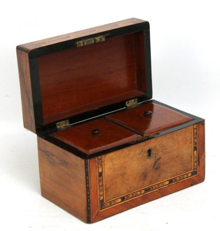 Lot 27 of 1656: A Victorian walnut and inlaid two division tea caddy, width 20.5cm.