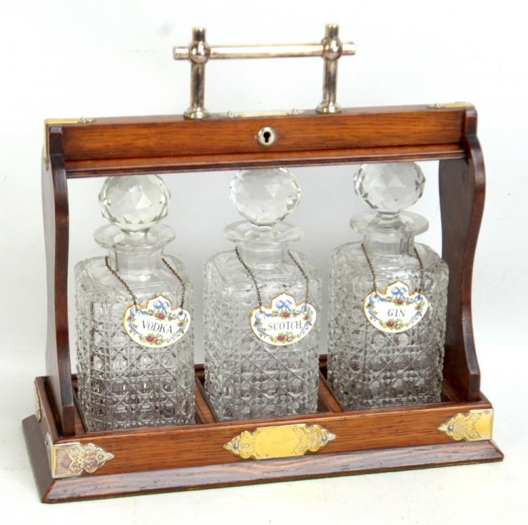 Lot 57 of 1656: A 1920s oak and silver plate mounted three bottle tantalus, with key and bottle labels to decanters.
