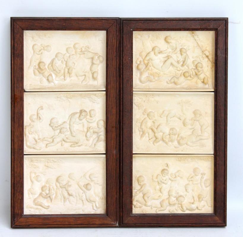 Lot 82 of 1656: A set of six plaster plaques depicting Bacchanalian figures and putti set in two oak framed, each frame 39 x 20cm (2).