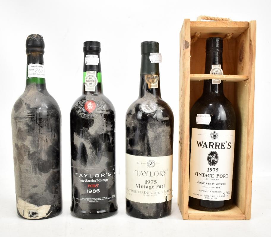 Lot 267A of 1656: TAYLOR'S: a bottle of vintage port 1975, a bottle of Taylor's late bottled vintage port 1986, a bottle of Warre's vintage port 1975 in presentation box, and a further unlabelled bottle (4).