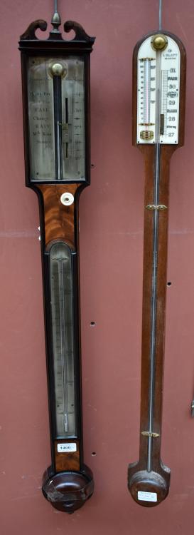 Lot 1400 of 1656: A 19th century mahogany stick barometer with silvered dial inscribed 'J. Semalvico & Son, 91 Hatton Garden', length 96cm, and a 20th century mahogany stick barometer (2).