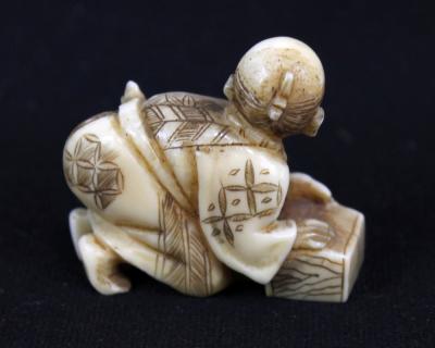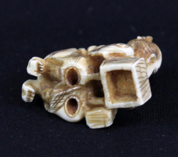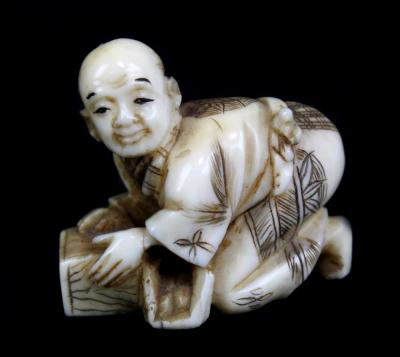 Lot 818 of 2080: An early 20th century Japanese carved ivory netsuke of a rat catcher, 3.2 x 3.7cm.