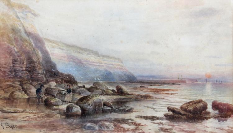 Lot 1049 of 2080: JOHN SYER (1815-1885); watercolour, coastal scene with couple fishing or shrimping to foreground and harbour with boats to background, signed lower left, 33.5 x 58cm, framed and glazed (glass af).