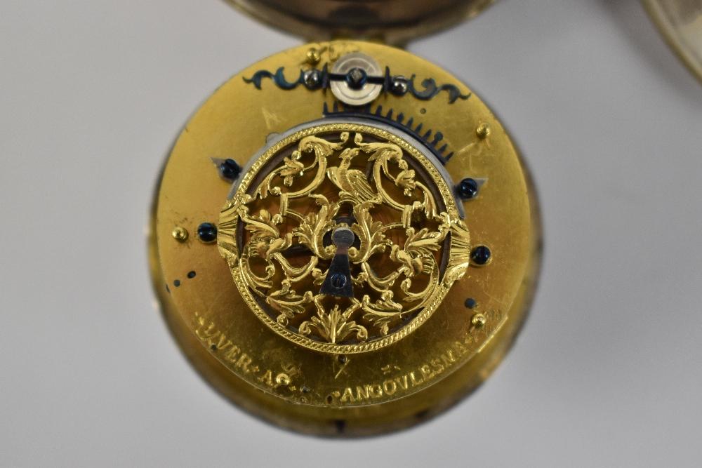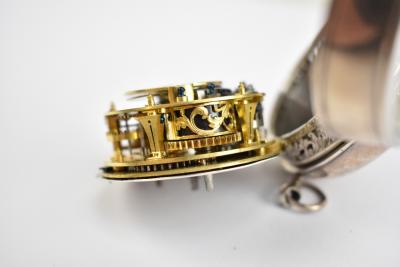 Lot 1759 of 2080: YVER A ANGOVLESME; a late 17th century silver oignon verge pocket watch with alarm, the dial set with champlevé Roman numerals, central alarm disc and enclosing a signed fusee movement with pierced engraved balance cock, divided Egyptian pillars and with plain case set with pierced gallery, diameter 5.6cm. For a virtually identical watch please see Messrs Christie's Important Watches London 20th March 2002, lot 6.