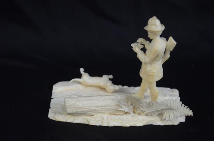 Lot 74 of 1822: An early 20th century carved ivory huntsman and dog figure group on naturally modelled base, base 10.3 x 5.7cm.