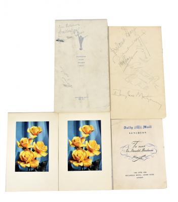 Lot 868A of 1822: WILLIAM HARTNELL, THE FIRST DR WHO; two autographs, both with additional 'Dr Who' beneath, obtained in person at the Dalek 'invasion' of RAF Finningley Air Show in September 1965, with further autographs including Donald Bradman signed Luncheon menu June 1956 and two National Film Award 1948 and 1949 Guest Lists bearing autographs including Douglass Montgomery, Dolores Gray, Michael Wilder, John McCallum, Richard Attenborough etc.