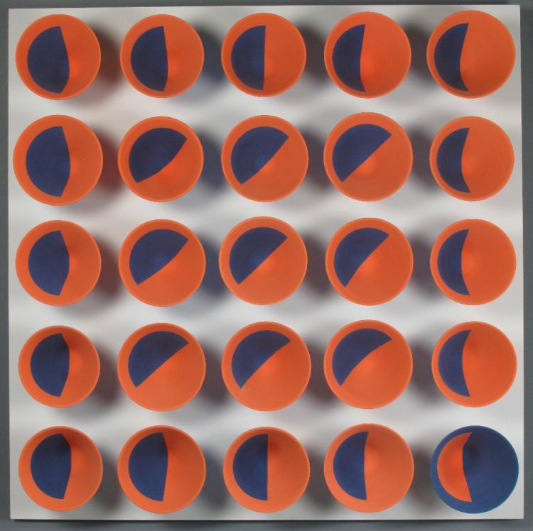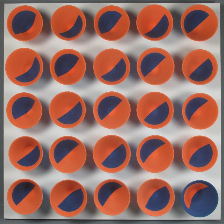 Lot 43 of 77: SARA MOORHOUSE (born 1974); Eclipse, 25 conical stoneware bowls, each painted with semi-circular shapes onto the interior surfaces with underglaze colour, attached to a square board with strong magnets to allow for alternative compositions to be displayed, 70 x 70cm. From a stationary viewing position, the shapes within each, although identical, appear different due to the varying angle of vision for each bowl. As the viewer perambulates the artwork, the semi-circles appear wider, almost as ful