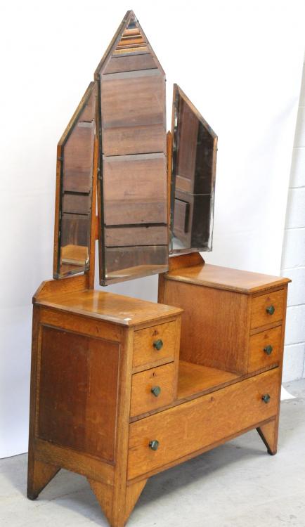 Lot 9 of 725: An early 20th century Arts and Crafts triptych dressing table with ecclesiastic triple mirrors over a drop centre base flanked by two small drawers over a single lower frieze drawer, on bracket feet, height 177cm.