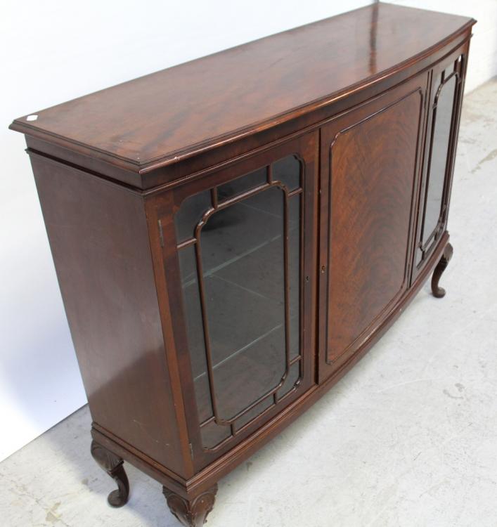 Lot 22 of 725: An early-to-mid 20th century mahogany bow-front bookcase cabinet with single panel door flanked on either side by glazed door enclosing glass shelves, all supported on carved cabriole legs, width 137cm.