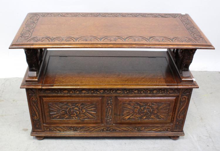 Lot 38 of 725: An early-to-mid 20th century oak monks' bench with carved back to carved lion arm rests above two foliate and floral carved panels to bun feet, length approx 102cm.