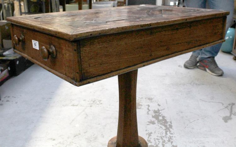 Lot 62 of 725: A 19th century oak parquetry table with single frieze drawer on octagonal quadripartite pedestal base, height approx 72cm.