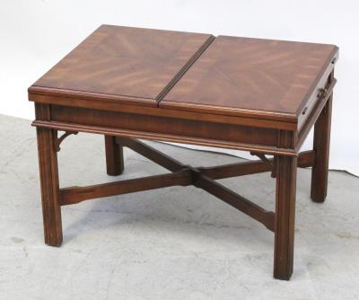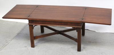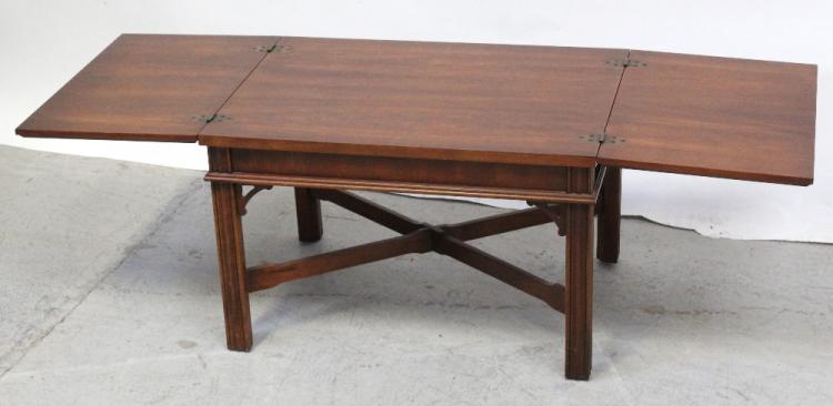 Lot 65 of 725: A reproduction three-section fold-out coffee table on reeded supports and cross-stretcher in the Oriental style, length when extended 130cm.