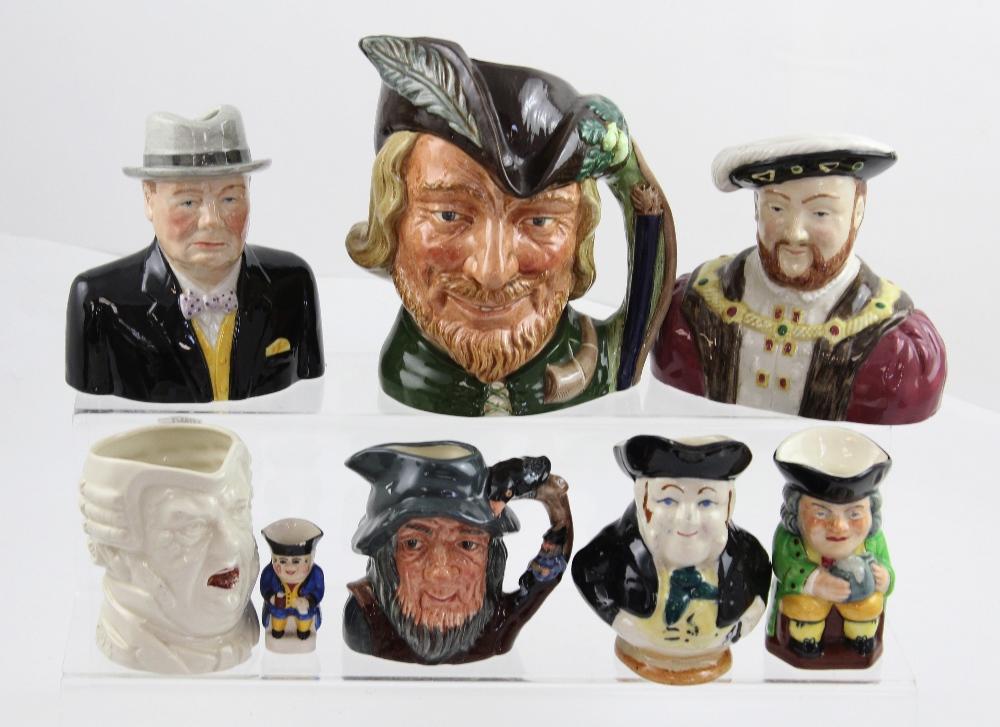 Lot 271 of 681: A Royal Doulton Robin Hood character jug, height 18cm, a smaller Rip Van Winkle example and a Royal Doulton 'Sergeant Buzfuz' character jug, also Williamsons Winston Churchill and King Henry VIII and other unmarked Toby jugs (8).