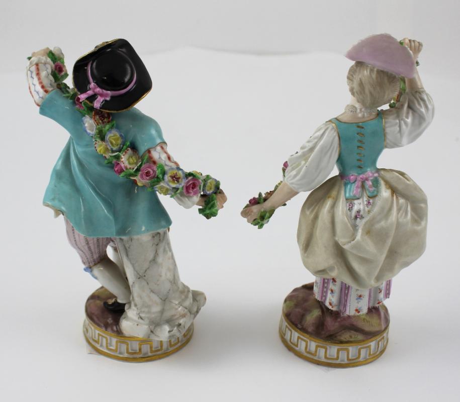 Lot 274 of 681: A pair of Meissen mid-to-late 19th century figures, a lady and gentleman in 17th century period costume both carrying floral swags, on circular base with gilt-heightened Greek key decoration, blue crossed sword marks to base, impressed no. J67 and '47' in red, height 17cm (2).