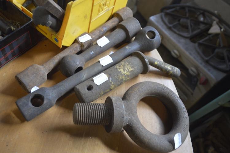Lot 121 of 442: Three ring spanners, length of longest approx. 12'', a heavy duty hook etc. (5)