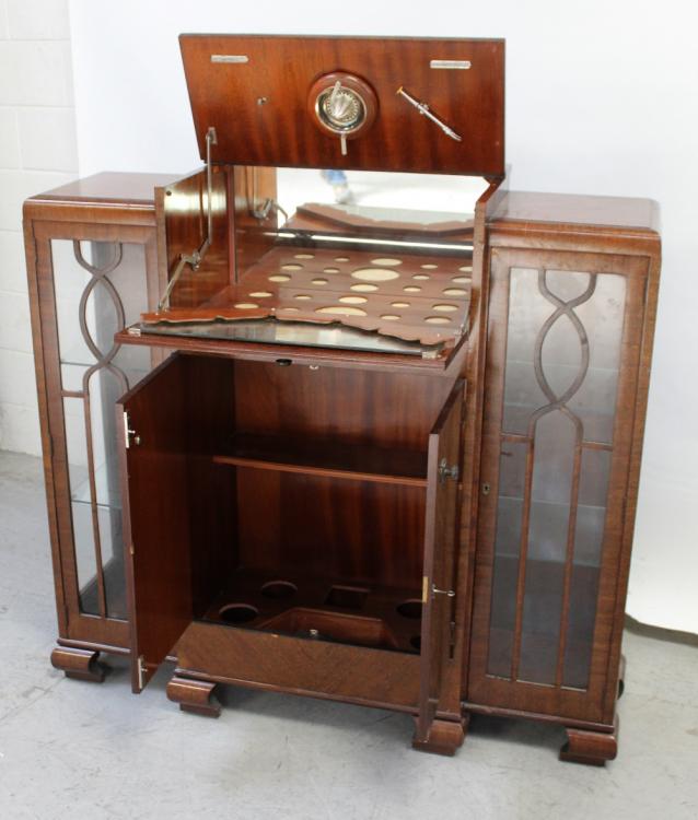 Lot 39 of 944: A mid-20th century Art Deco style display/cocktail cabinet, central fall-front with lift-up top with mirror-back interior over two cupboard doors with interior shelf and bottle holders, two astral glazed doors to either side, on shaped block supports, 120 x 120cm.