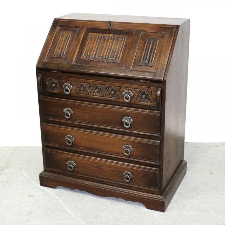 Lot 53 of 959: A Wood Brothers style linen-fold panelled elevated bookcase, the leaded upper section surmounting a three-panel fall on manual lopers over a four-drawer chest base on shaped plinth, height 210cm.