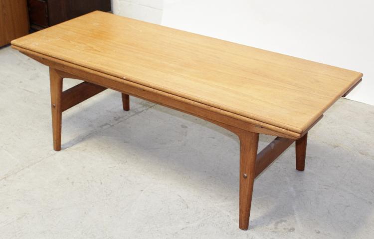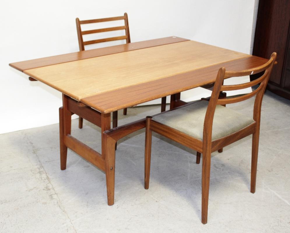 Lot 60 of 959: A Scandinavian-style metamorphic drop-leaf dining table/coffee table on rise-and-fall mechanism framed base, when extended 91 x 135cm and two Scandinavian-style dining chairs (3).