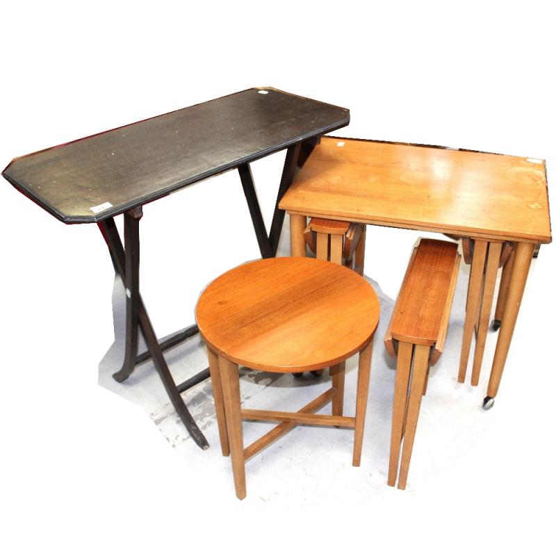 Lot 61 of 959: A mahogany folding coaching table in dark stained finish and a 1970s folding nest of five teak tables, width approx 61.5cm (2).