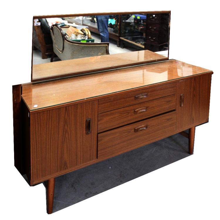 Lot 62 of 959: A 1960s teak laminate dressing table with central bank of three drawers flanked by twin cupboards, on turned tapering legs and a matching six-drawer teak laminate chest, height approx 94cm (2).