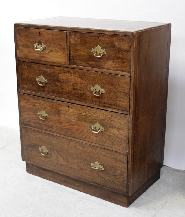 Lot 65 of 959: An early 20th century oak two-over-three chest of drawers, on plinth supports, in need of restoration, 115cm.