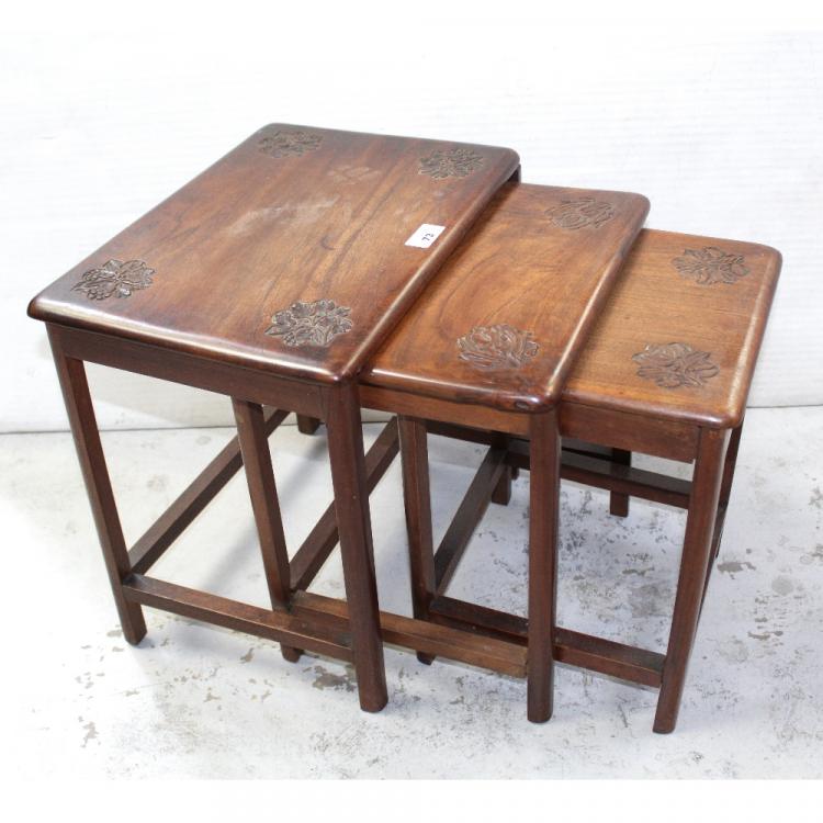 Lot 73 of 959: A small nest of walnut tables with incised stylised floral decoration to the corners of each of the tops, height of largest 39.5cm.