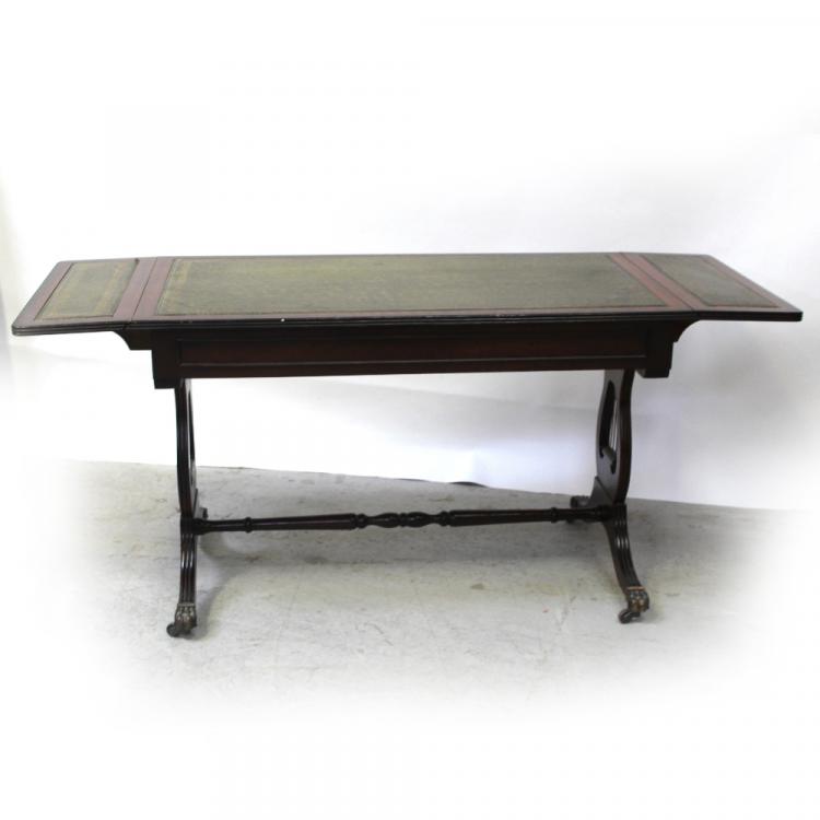 Lot 77 of 959: A 20th century mahogany reproduction sofa table with tooled green leather insets, width 89cm.