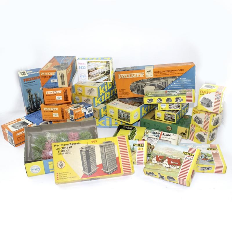Lot 673 of 959: A large quantity of railway related boxed kit models to include, ten Vollmer, 5017 Storage Tank, 5513, 5512, 5514 and 5516 Hydro Boilers, V521 Hydrierturm, two 2509 model stonework bridge, V513B horizontal tank, trebl, and 5519 horizontal tank, double, a quantity of Kilburi kit models to include 9904 Esso Tank, 9906 Esso Tank, 9901 Esso Storage Depot, various other kits, two boxes of Airfix farm stock and civilians, a quantity of Faller mainly Alpine buildings, trees and other accessories.