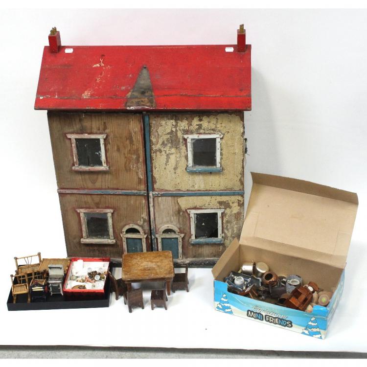 Lot 677 of 959: A vintage dolls' house with double front opening (af) and a quantity of dolls' furniture and accessories to include a longcase clock, grand piano, wooden kitchenalia, small ceramic jugs, metal pots and pans, coal scuttle etc.
