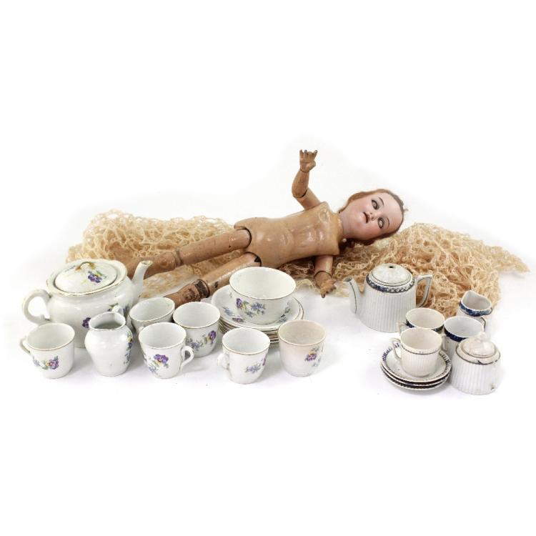 Lot 680 of 959: Armand Marseille; a bisque head doll with articulated limbs and composite body, model 390 and a basket containing a children's tea set (af).