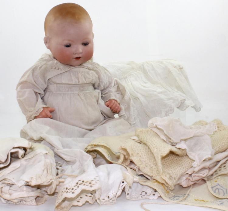 Lot 682 of 959: An early 20th century German Armand Marseille bisque head doll with open-and-close eyes and composite body and a quantity of early 20th century babies' and dolls' clothes.