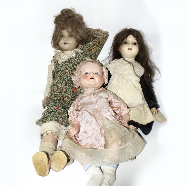 Lot 690 of 959: A Deans composite head doll with open-and-close eyes, height approx 60cm, two large bisque head dolls, one previously sold through Sotheby's in 1985, height approx 75cm (3).