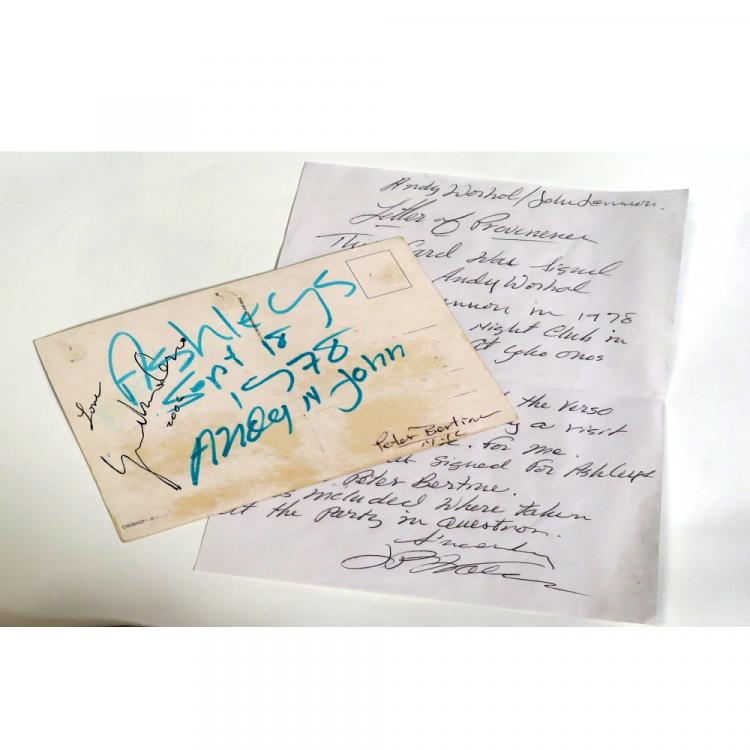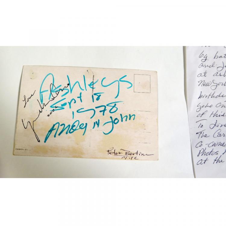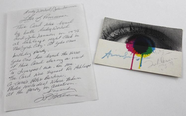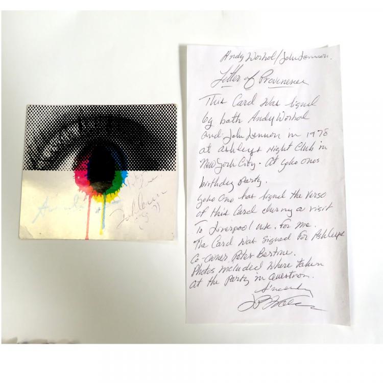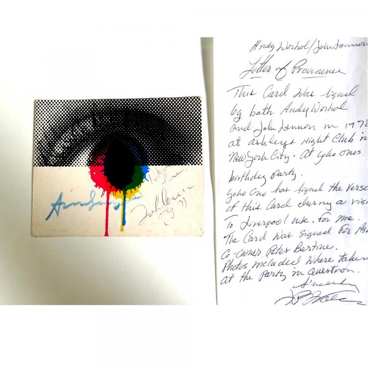 Lot 715 of 959: A postcard of a Pop Art eye with dripping colour signed by both John Lennon and Andy Warhol, amongst other signatories, signed verso by Yoko Ono, also verso 'Ashley's September 18 1978 Andy and John', with letter of provenance stating that the autographs were obtained in Ashley's Night Club in New York City at Yoko Ono's birthday party, approx 15 x 10.5cm.