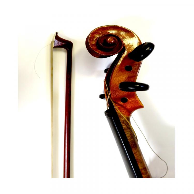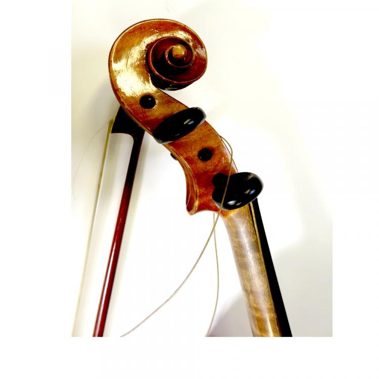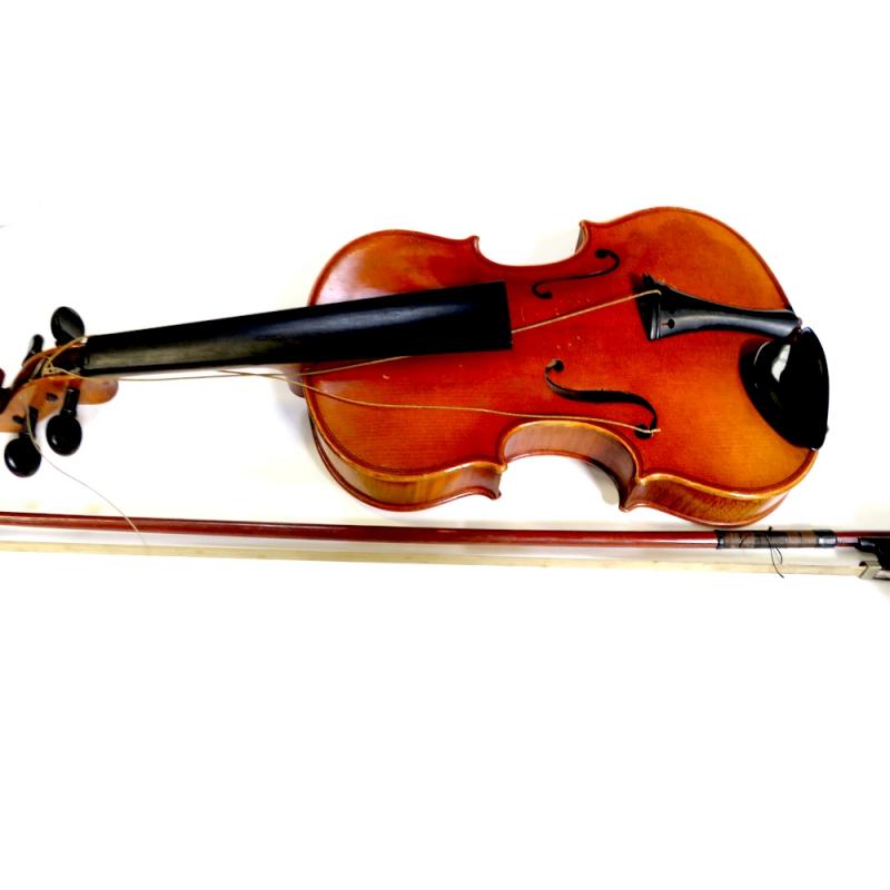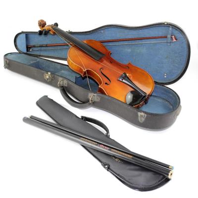 Lot 720 of 959: A cased c1940s students' violin, across back 37cm with a nickel-mounted bow a nd a two-piece Brierley 'Storm' pool cue with case, length approx 146cm (2).