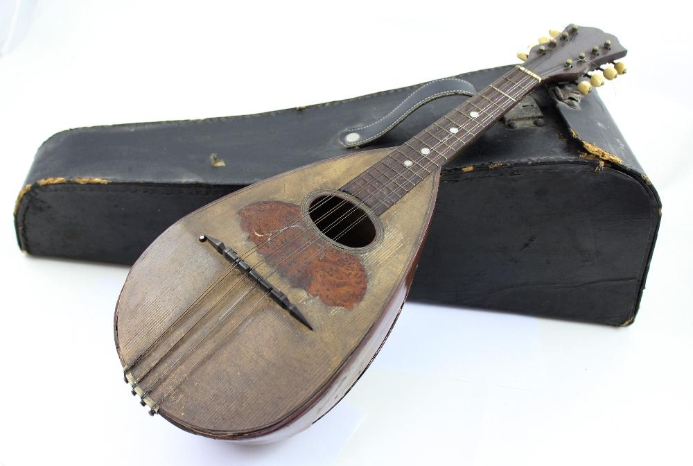 Lot 722 of 959: An F De Mureda mandolin with rounded back and presented in black Moroccan leather case, length 60.5cm.