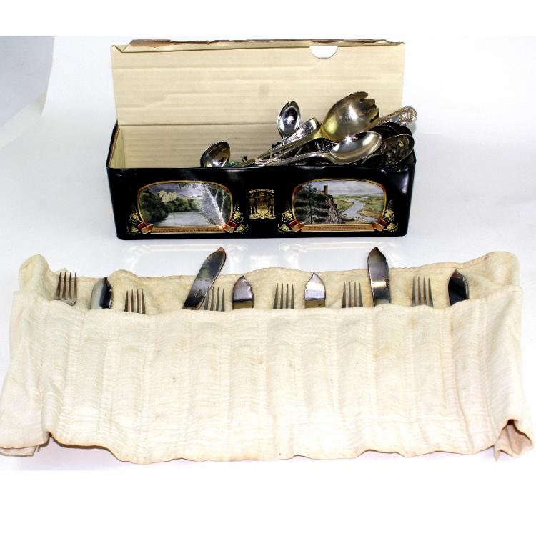Lot 732 of 959: A collection of plated flatware to include plated berry spoon, George V Silver Jubilee, salad servers, a patent mechanical pickle spoon, assorted silver and EPNS spoons and fish knives and forks.