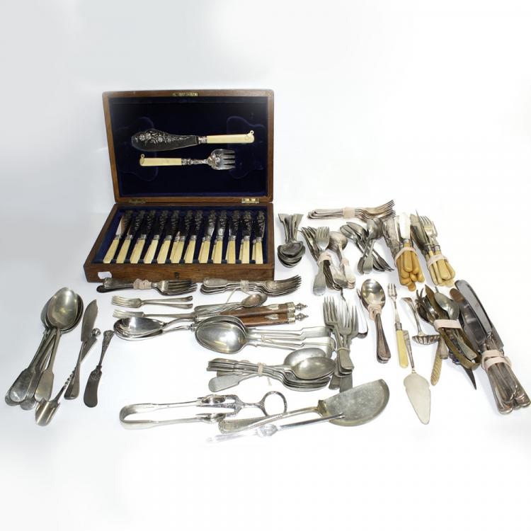 Lot 733 of 959: A quantity of plated ware, mainly flatware and a cased set of plated fish knives, forks and servers.