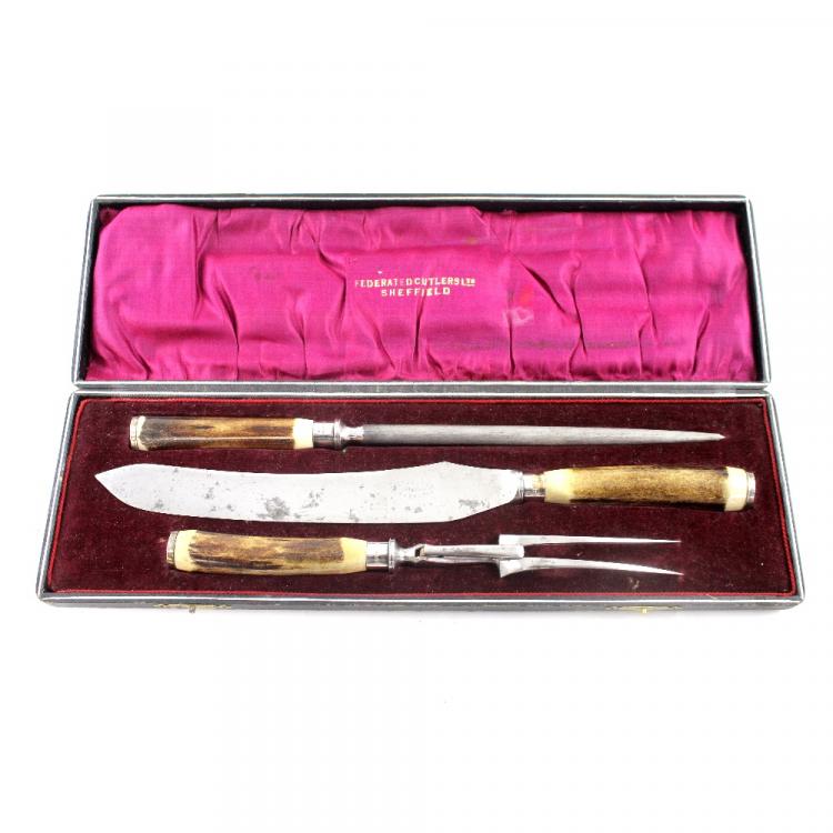 Lot 776 of 959: A cased 'Federated Cutlers Ltd Sheffield' carving set with hallmarked silver collars and finials to horn handles, Sheffield 1908.