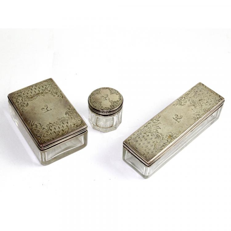 Lot 778 of 959: Three Victorian silver-topped dressing table jars, Thomas Whitehouse, London 1866, one of elongated rectangular form, length approx 12.5cm, one of squared rectangular form and a circular example, all with diaper pattern decoration and dog head heraldic device, retailed through Harold James & Co of Regent Street, weighable silver approx 2.5ozt (3).