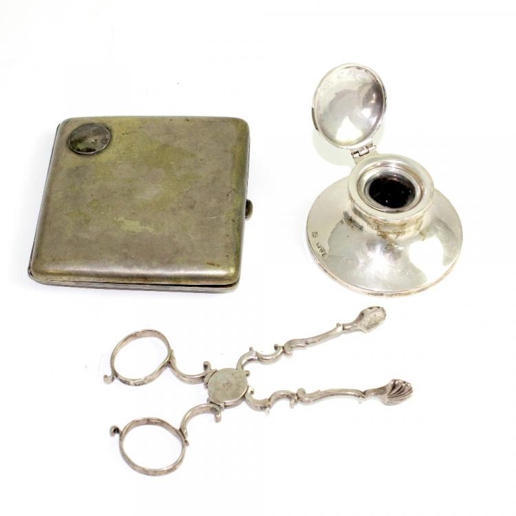 Lot 779 of 959: A George III pair of hallmarked silver sugar nips by Henry Plumpton, a George V hallmarked silver capstan inkwell, assayed Chester, maker's mark rubbed and a nickel cigarette case markes '21st Mars 1895' (3).