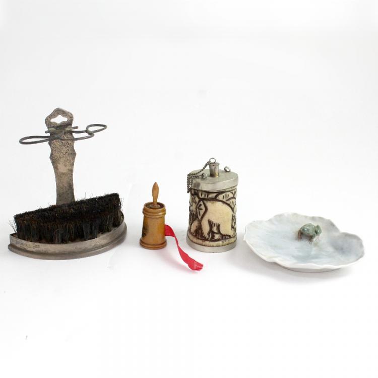 Lot 780 of 959: An Edward VII hallmarked silver brush stand, possibly military, William Comyns & Sons, London 1904, a Mauchline ware ribbon holder, a Copenhagen lily pad and frog dish and a modern bone carved and nickel-mounted African canister, height approx 7.5cm (4).